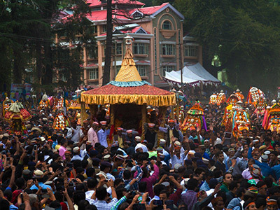 Unlike in other parts of India, where Dussehra marks the concluding of Navratri festival, in Kullu, Himachal Pradesh, it marks the first day of the seven-day long festival. The festival here begins with a procession on decorated chariots taking the idol of Lord Raghunath (as lord Rama is locally called) across the town with the rhythmic playing of drums and other musical instruments. The next six days are full of devotion, prayers, folk dances, rituals, traditions, and celebrations. The festival concludes with a bonfire symbolizing burning of Ravana's kingdom, Lanka (locally called Lanka Dahan).