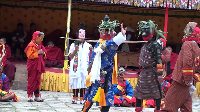 During the festival, the 'pazaps' or local militiamen, dressed in colorful battle gear, ride the horse and showcase a battle scene. At the end of the festival, there is a display of giant Thangka with images of Zhabdrung Nawang Namgyal.