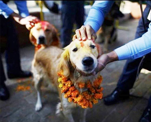 In Nepal, Diwali is observed as Tihar, with a five-day grand celebration. The first day of this festival is Kag Tihar. On this day crows are worshipped as the vehicle for Yamaraj, the god of death. On the second day, dogs are revered, while on the third day the cow and Goddess Lakshmi are worshipped. On the fourth day, the Newar community mark their New Year.